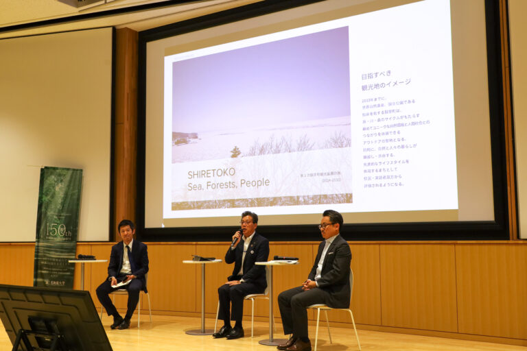 The latter half featured two panel discussions. The first panel included Mayor Hiroaki Yamauchi of Shari Town and Associate Professor Yusuke Ishiguro of the Graduate School of International Media, Communication, and Tourism Studies. The second panel featured Mayor Mitsugi Takenaka of Kamishihoro Town and Professor Suguru Mori of the Faculty of Engineering. The discussions highlighted examples where Hokkaido University researchers collaborated on actual community development projects, detailing the processes and outcomes. The mayors also shared their expectations for the university and the forum. Mayor Yamauchi stated, “I see challenges as opportunities for growth. I want the university’s research outcomes to be concretely applied to our town to solve the problems we face. Also, I look forward to leveraging the power of faculty and young students.”