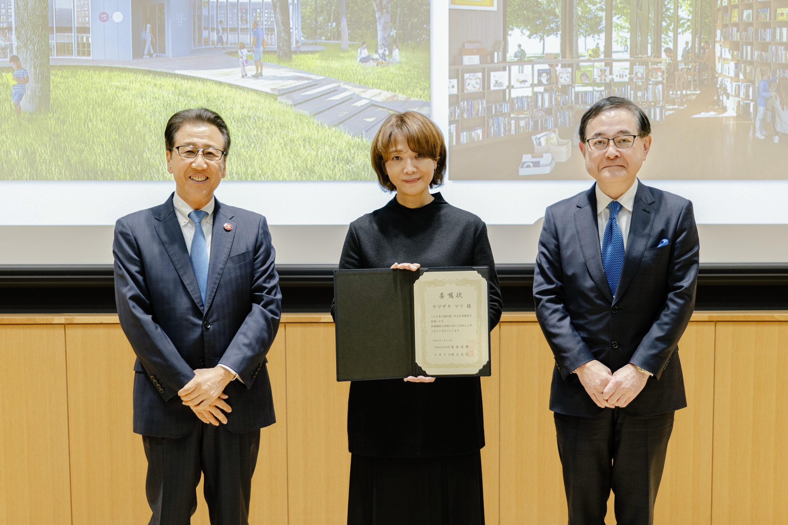 On January 30, 2026, a letter of appointment ceremony was held at the Global Research Center for Food & Medical Innovation (FMI) on the Sapporo Campus. Receiving her letter of appointment from the Mayor of Sapporo, Yamazaki shared her view of the library’s value: “Libraries provide the most essential nourishment for the human mind. I believe they are the places that teach us the importance of thinking about things and letting our curiosity and imagination expand.” She added, “I find myself imagining opportunities to directly share with children how books have helped me personally.”