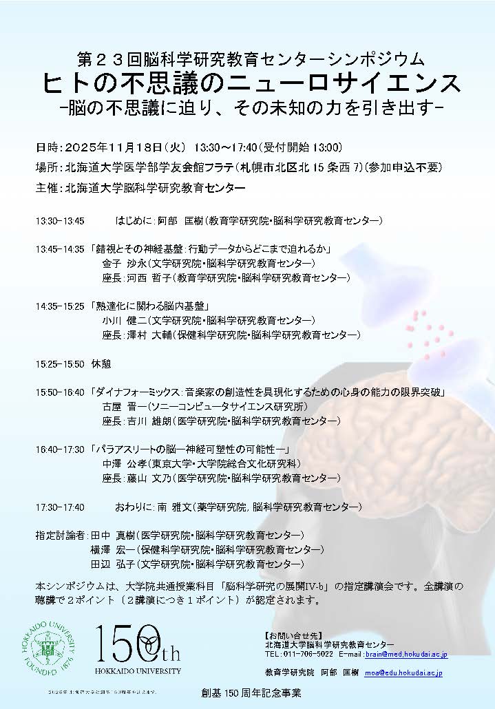 2025年11月18日創基150周年記念事業/第23回脳科学研究教育センターシンポジウム ヒトの不思議のニューロサイエンス開催のお知らせ- 講演会