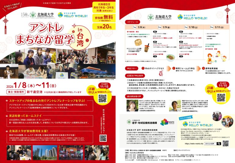 高校生・高専生向けアントレプレナーシップ教育プログラム「アントレまちなか留学in台湾」を開催します。 台湾で行う3泊4日の本プログラムは、外国人家庭等にホームステイしながら、ワークショップや、スタートアップアクセラレーター訪問等を通して、多様性への理解や創造力、挑戦する力などのアントレプレナーシップを身に付けることを目的としています。