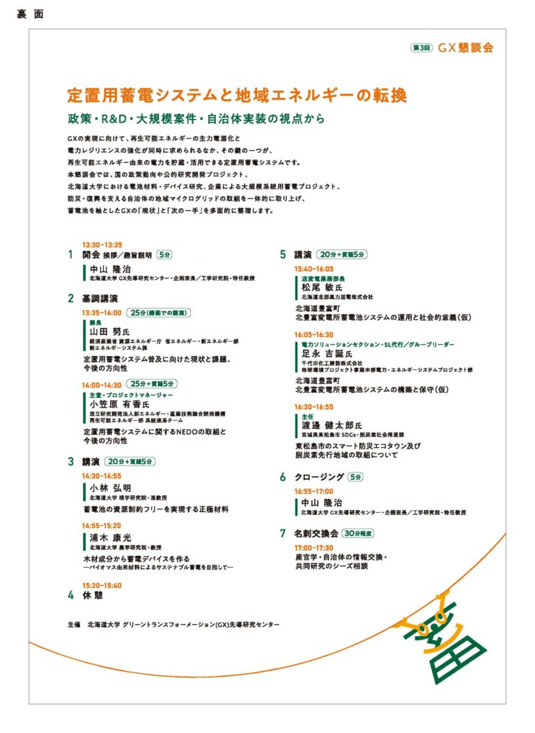 本懇談会では、国の政策動向や公的研究開発プロジェクト、北海道大学における電池材料・デバイス研究、企業による大規模系統用蓄電プロジェクト、防災・復興を支える自治体の地域マイクログリッドの取組を一体的に取り上げ、蓄電池を軸としたGX の「現状」と「次の一手」を多面的に整理します。