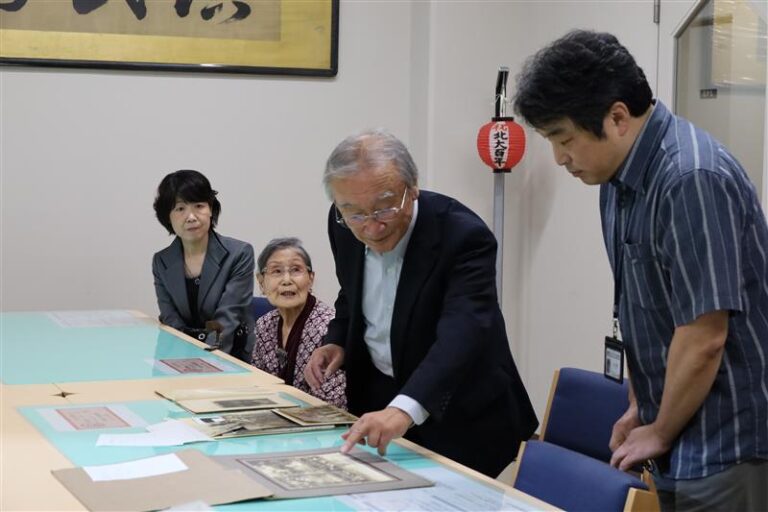 今回は、一般社団法人札幌農学同窓会の松井博和理事長、一般財団法人新渡戸基金(岩手県盛岡市)の藤井 茂理事長のご紹介で、寳金清博総長に寄贈されました。寄贈式に先立ち、寄贈写真の収蔵先となる大学文書館を訪れて、盛岡と札幌農学校との歴史的なつながりや、1920年代当時のキャンパスの景観などについて、和やかに歓談されました。