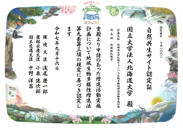 9月16日(火)、札幌キャンパスが「地域における生物の多様性の増進のための活動の促進等に関する法律(地域生物多様性増進法)」に基づく自然共生サイトに認定されました。これを受けて、9月30日(火)に東京都千代田区にある砂防会館で執り行われた「令和7年度第1回自然共生サイト認定式」には、根本和宜サステイナビリティ推進機構特任教授、北岡真吾同機構特任准教授及び廣重勝彦東京オフィス副所長が出席し、自然共生サイト認定証及び認定記念楯が授与されました。