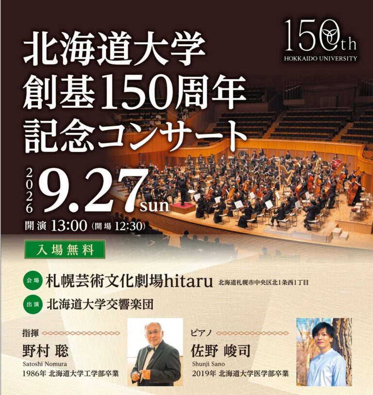 北海道大学交響楽団による。指揮は野村聡(1986年工学部卒)、ピアノは佐野峻司(2019年医学部卒)を招へい。全席入場無料。