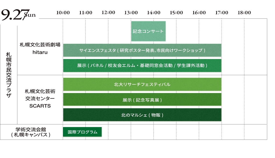 オープニング・記念式典では、創基150年の歩みを伝える記念映像の上映を行うとともに、式辞および来賓祝辞を予定ししています。あわせて、総長より未来に向けたメッセージを発信し、北海道大学交響楽団による演奏を交え、創基150周年の節目を象徴する式典を実施します。